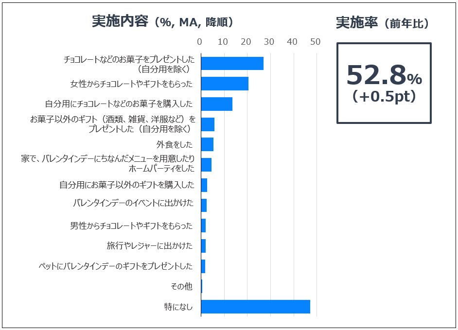 バレンタインデーの実施率は52.8%で、昨年とほぼ横ばいでした。
