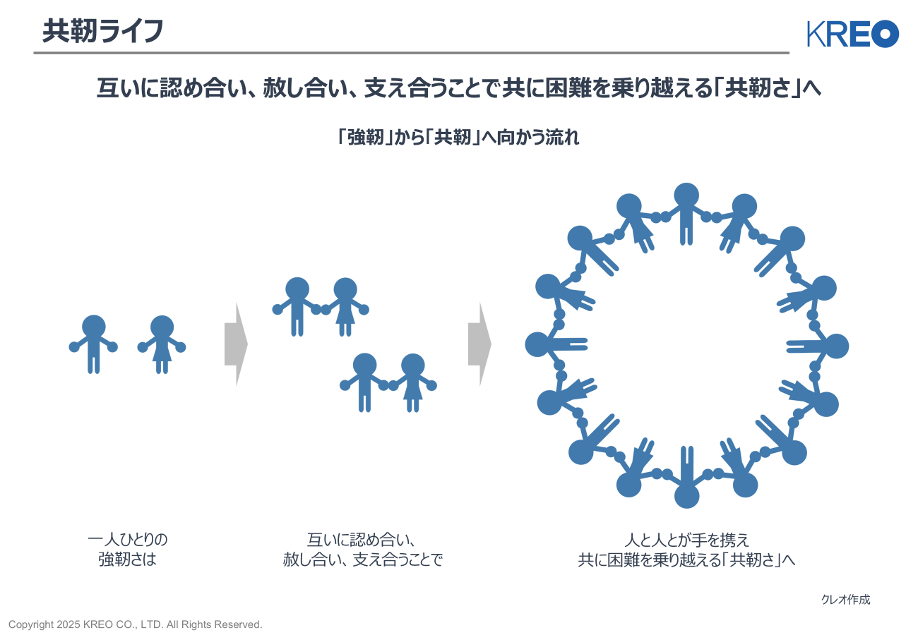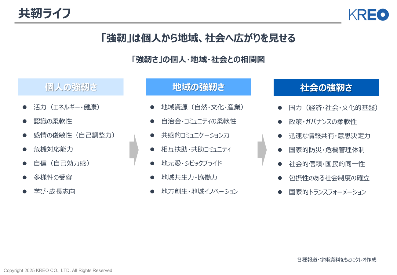 個人の「強靭さ」と地域、社会の「強靭さ」は連動しており、個人、地域、社会が一本の線で繋がった状態で「強くしなやかである」ことが社会を前進させていきます。そして、互いに認め合い赦し合い支え合うことで共に困難を乗り越えていく「共靭さ」という新たな生活価値観を生み出しています。