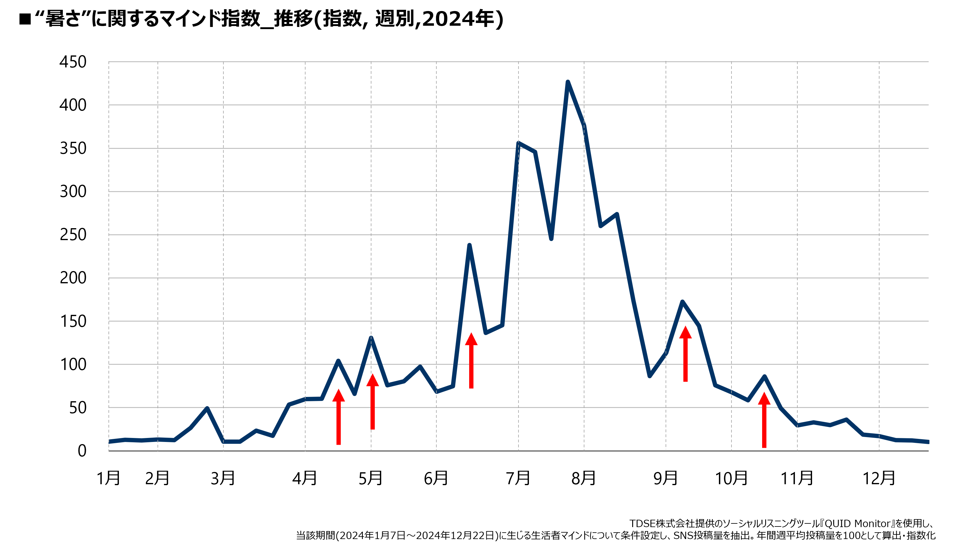 クレオではSNS上の投稿数を独自に指数化した「マインド指数」を指標として用い、生活者が“暑い”と感じ始めるタイミングを把握しています。