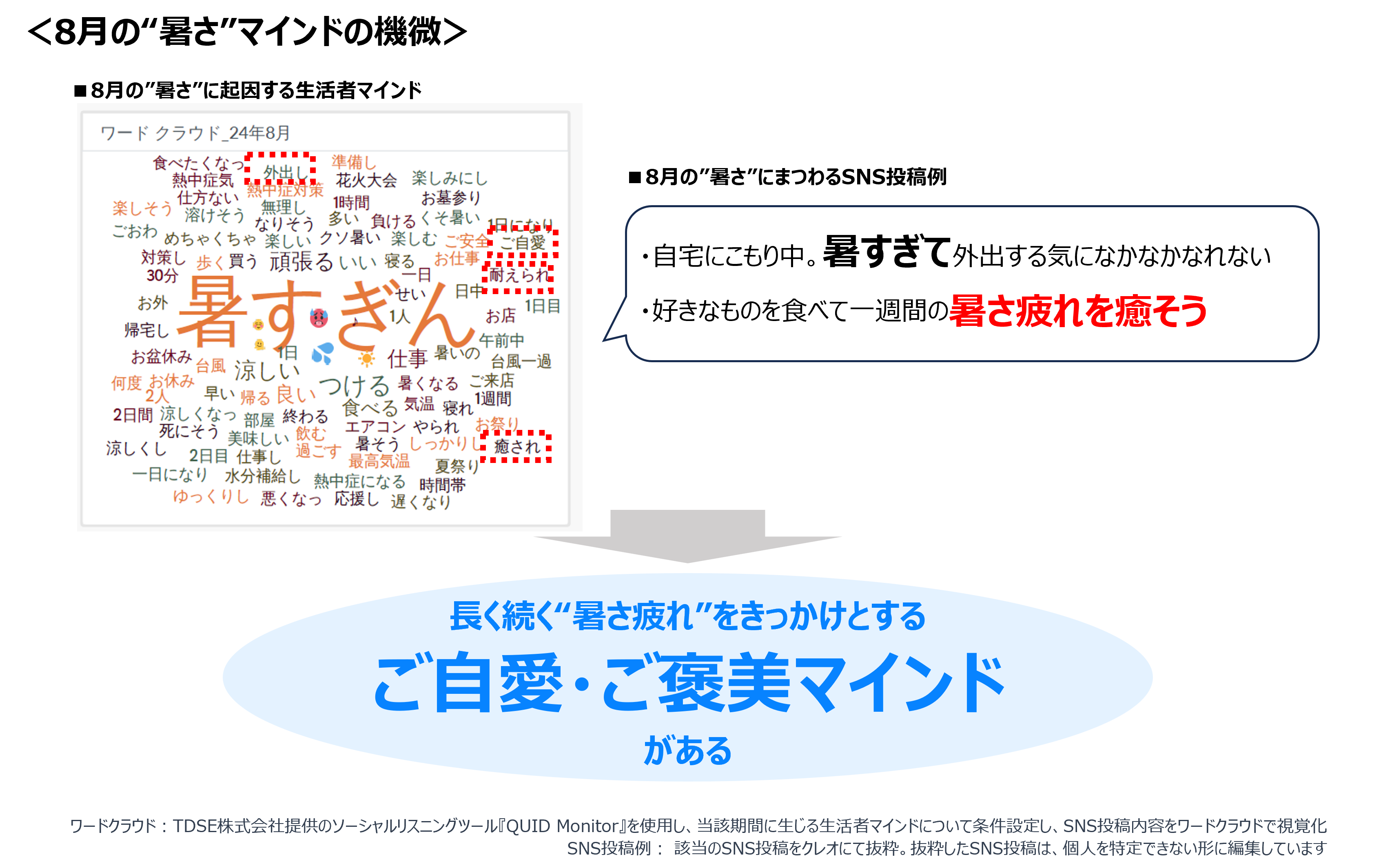 8月の暑さに関する投稿内容の傾向をワードクラウドで可視化すると、「暑すぎる」「耐えられない」「外出し(たくない)」といった、“暑さの耐え難さ”を訴える投稿が見られます。また「ご自愛」「癒され」といった言葉も共起ワードとして現れてきており、これに紐づく具体的な投稿は、“一週間の暑さ疲れを癒す”ための欲求や行動に関するものです。つまり、8月は【酷暑疲れに対する自分へのご褒美】マインドがあることがうかがえます。