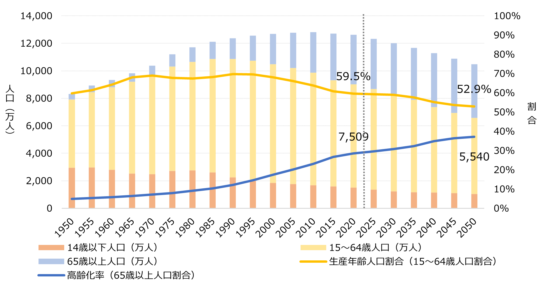 今後少子高齢化の進行により、日本の生産年齢人口はさらに減少し、生産年齢割合は2050年には52.9%と、2025年(59.5%)から6.6ポイント減少する見込みです。すなわち、人材獲得競争がさらに激化するのが確実な状況です(図1)。