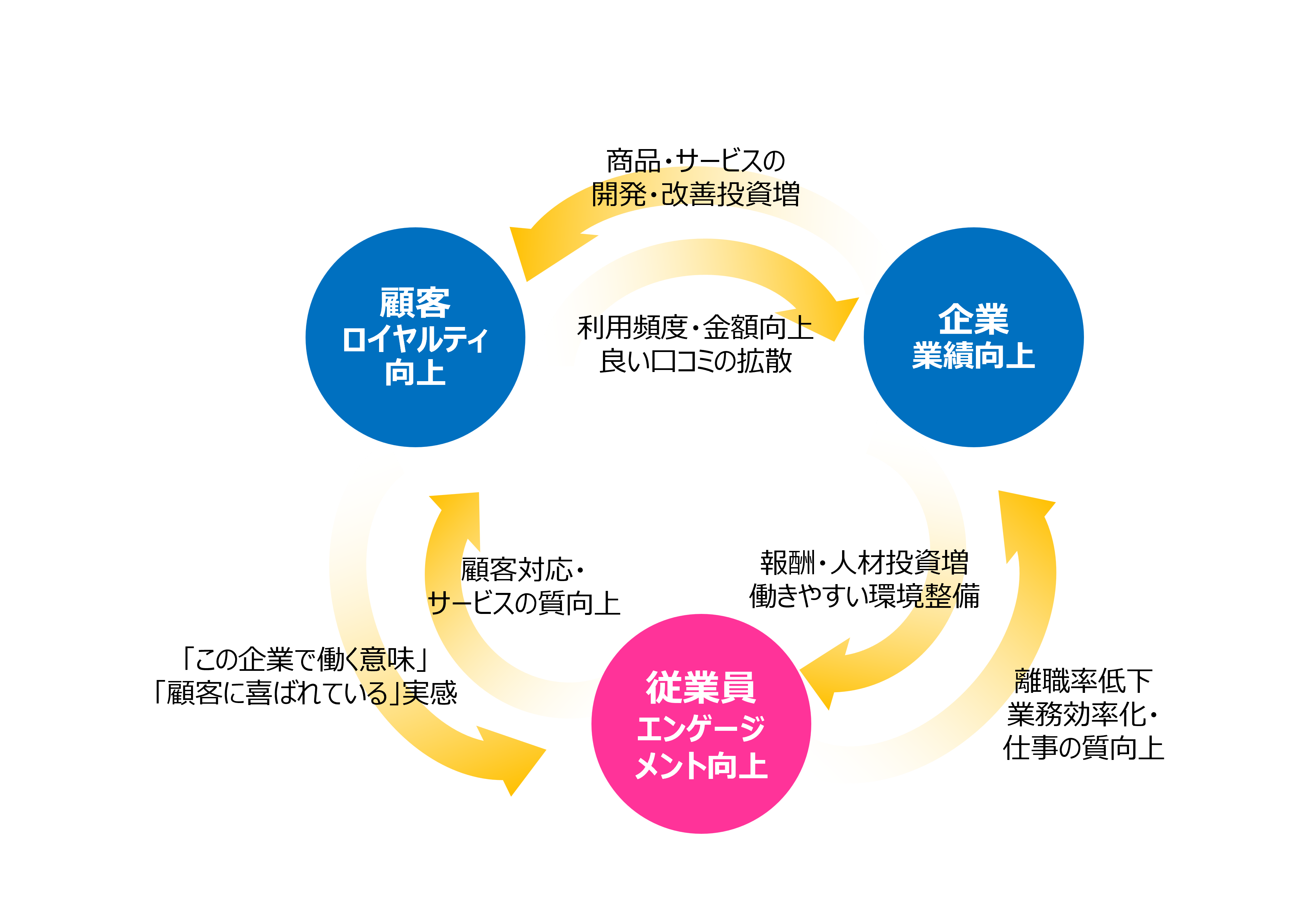 「価値循環による成長モデル」は、従業員エンゲージメントを向上させるため、風通しの良い組織・制度・企業文化といった土壌を整備することにより、顧客ロイヤルティ(顧客の企業に対する愛着や満足度)の向上、企業の成長という『三方良し』の好循環サイクルが実現できるという考え方です(図2)。