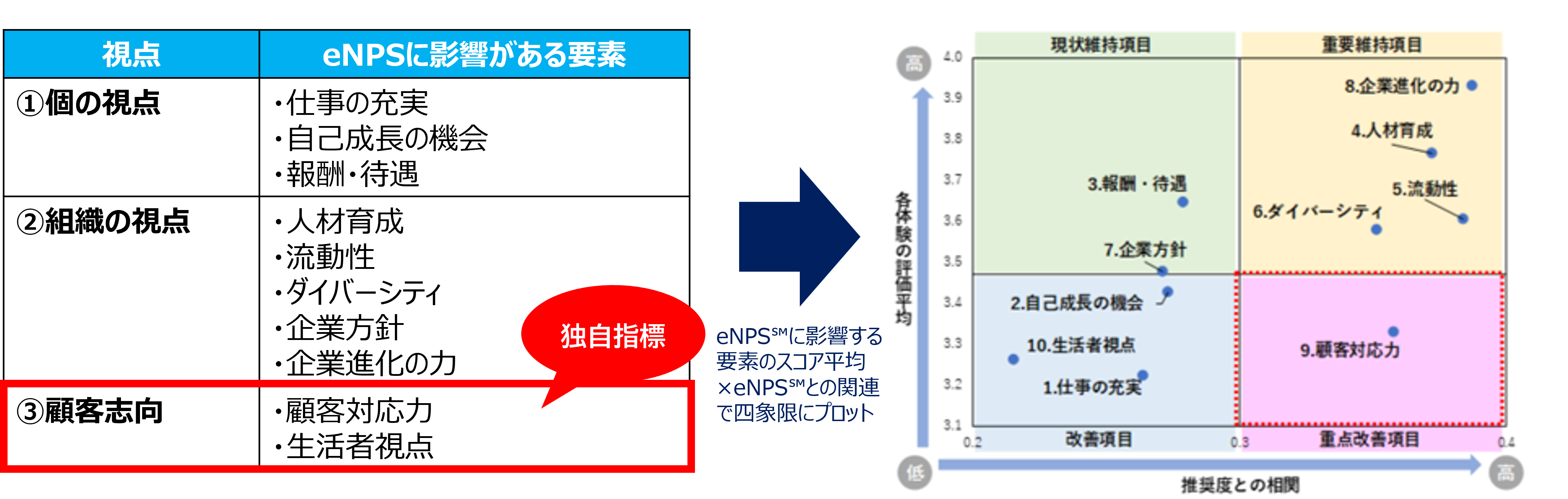 図7:深堀5項目(左表)とeNPSsmとの関連を示したポートフォリオ(右図)