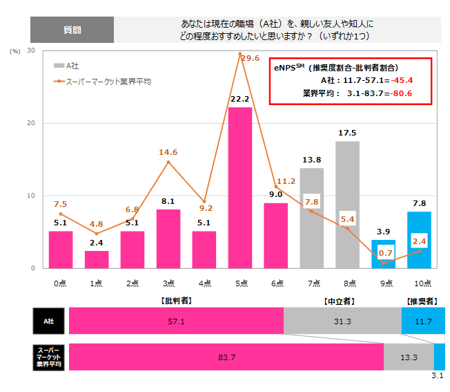 図5:A社とスーパーマーケット業界平均のeNPS℠ならびにスコア分布