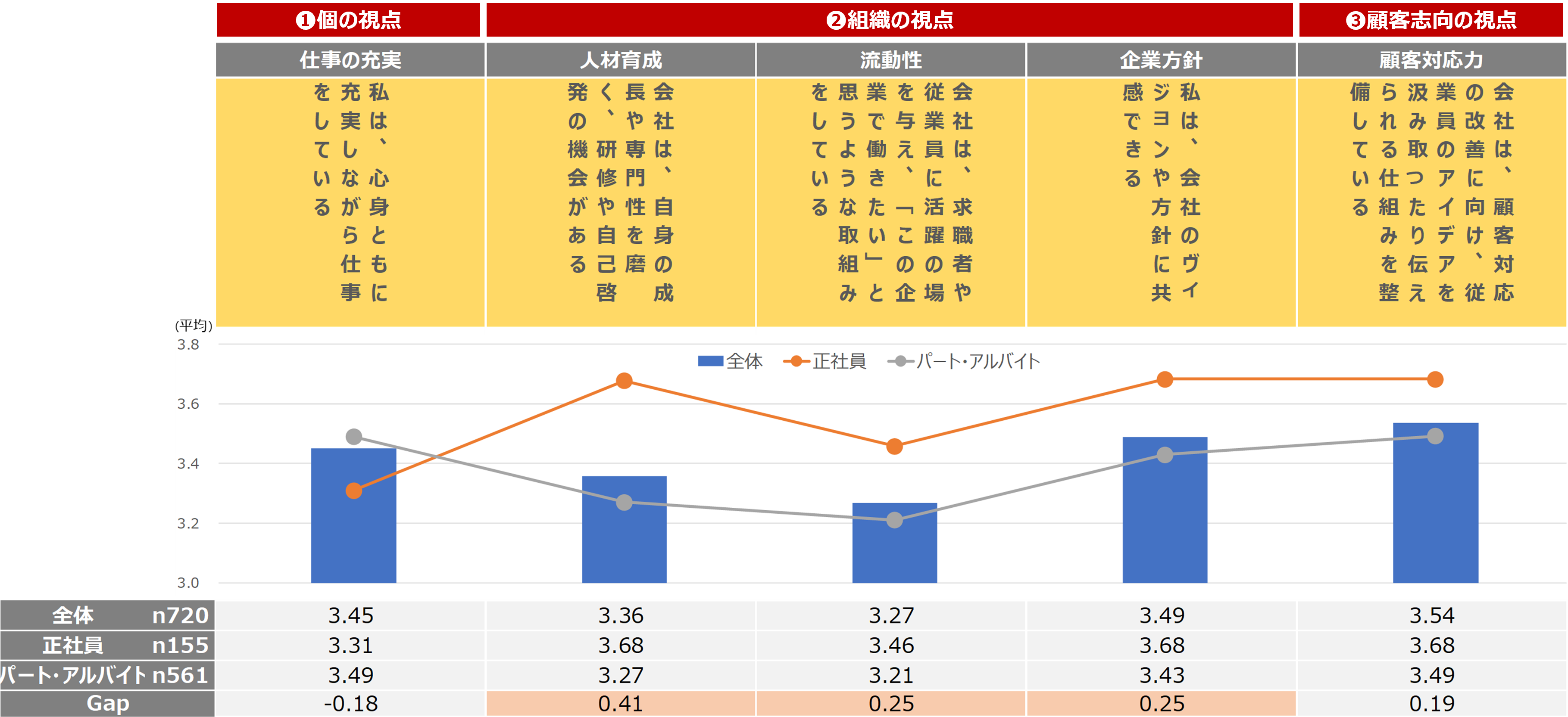 次に、前述した深堀5項目について、正社員と従業員でスコアを比較しました。その結果、「人材育成」「流動性」「企業方針」でギャップが大きいことがわかりました。このことから、A社のパート・アルバイトは正社員と比較して、成長機会の認識が低く、企業への共感が充分に醸成されていないことがうかがえました。