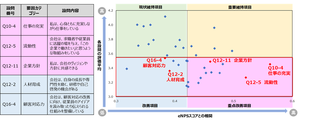 そして、各要素のスコア平均をeNPS℠との関連とかけ合わせた四象限にプロットし、ポートフォリオ化します。これにより、現在はスコアが低いが、スコアを伸ばすことでeNPS℠向上が期待できる要素(取り組み優先度の高い要素)が見えてきます(図4右のピンクの領域)。