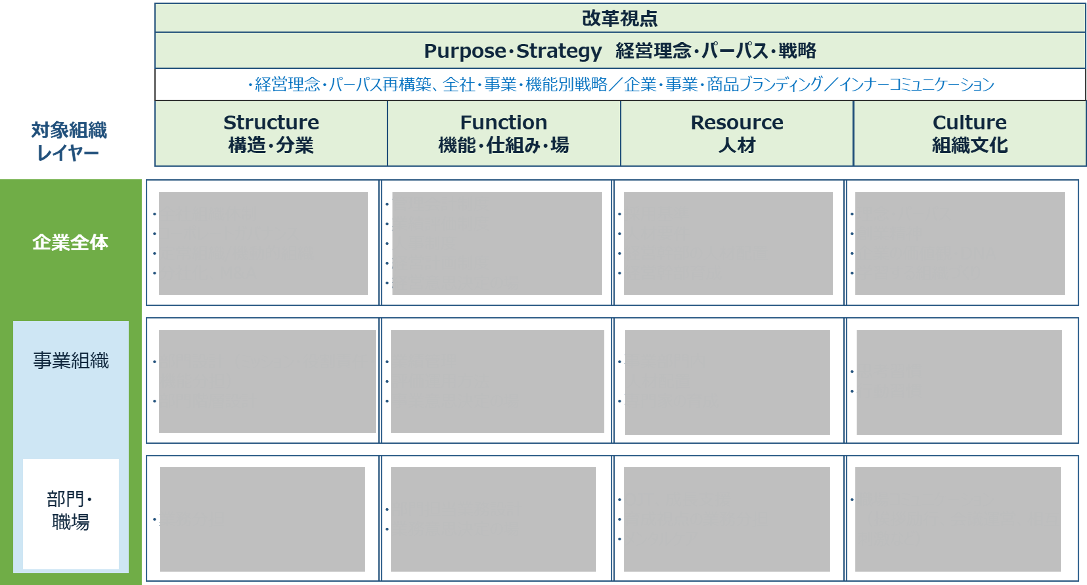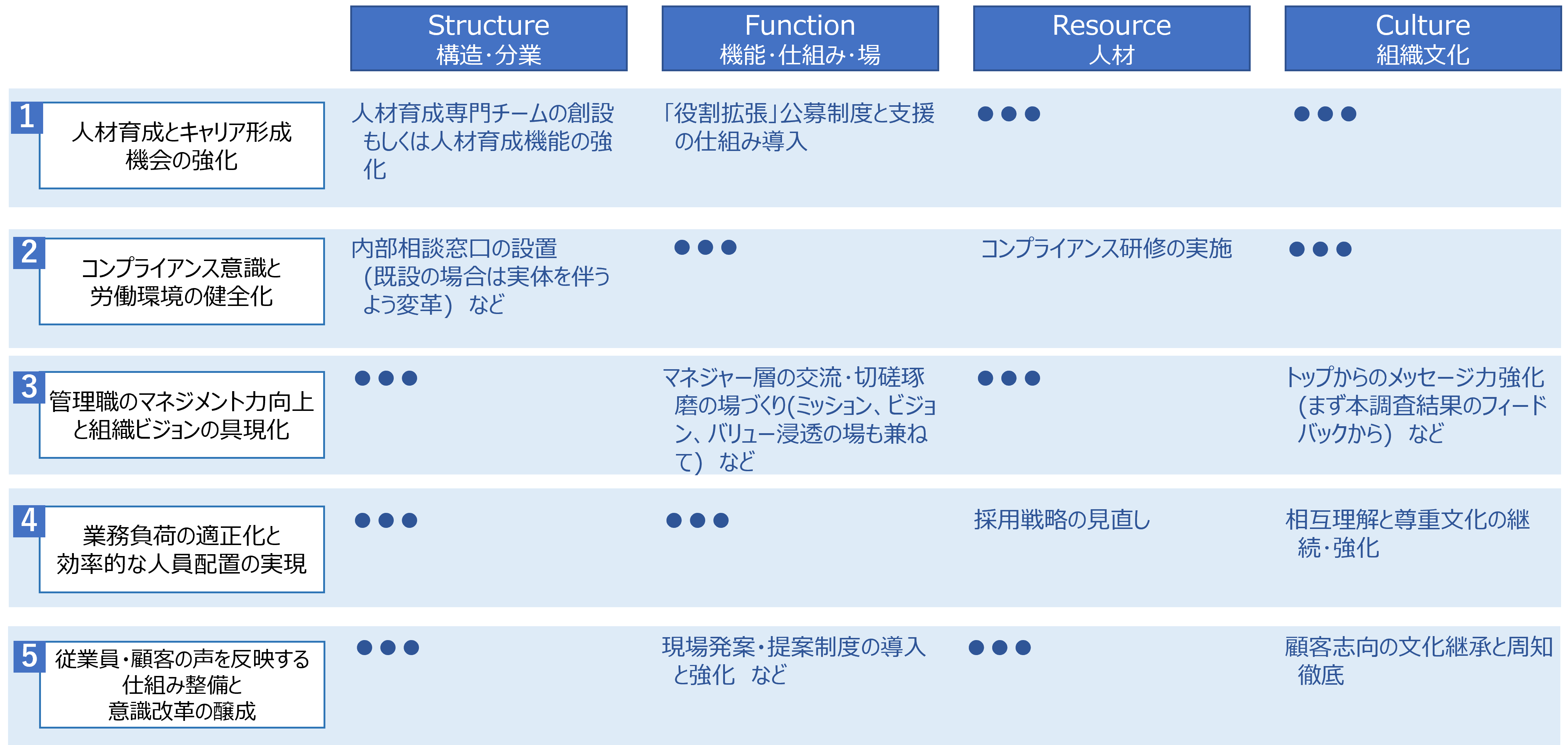 その際に活用するのが、「組織」「機能」「人材」「組織文化」の視点から経営戦略の課題・原因を構造的に特定できる手法、「SFRC」フレームワーク)です(表1)。