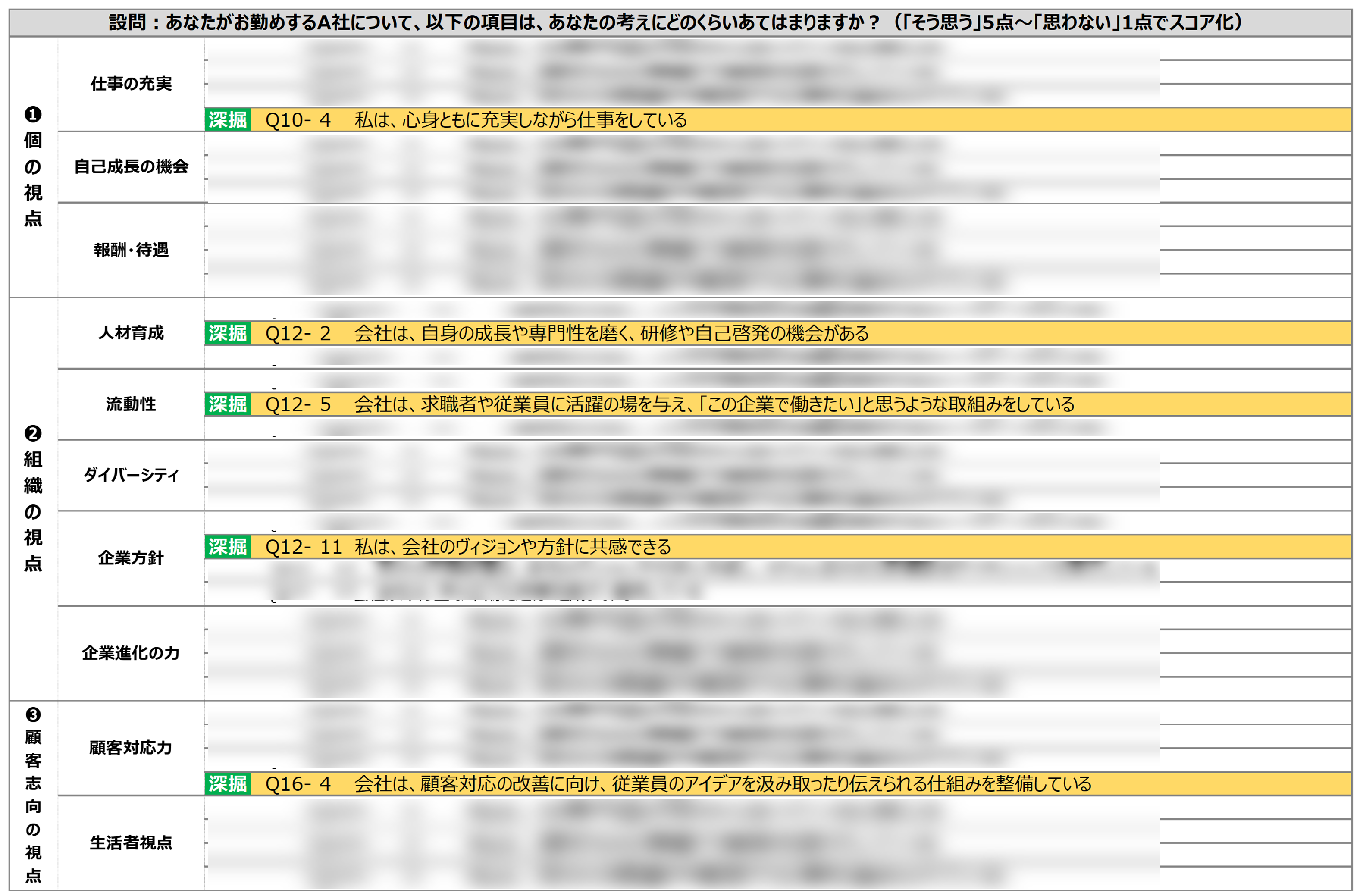 従業員に対してWEBアンケートを行うにあたっては、eNPS℠の影響要素である36項目の中から深堀する項目を選定します。今回は、A社からの事前ヒアリング結果を踏まえ、表2に示した「仕事の充実」「人材育成」「流動性」「企業方針」「顧客対応力」分野の5項目を深堀することになりました。