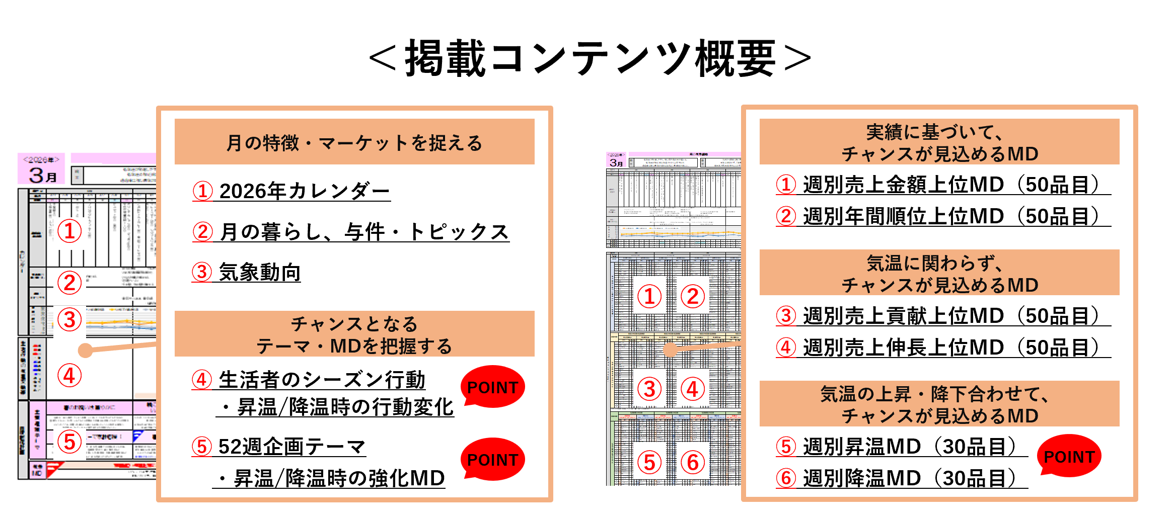 「カレンダー・社会トピックス」「生活者のシーズン行動」「週ごとの販促テーマと注力MD」「売上金額上位MD・年間順位上位MD」までを網羅し、販促企画立案や当月の販売効率向上をサポートします。