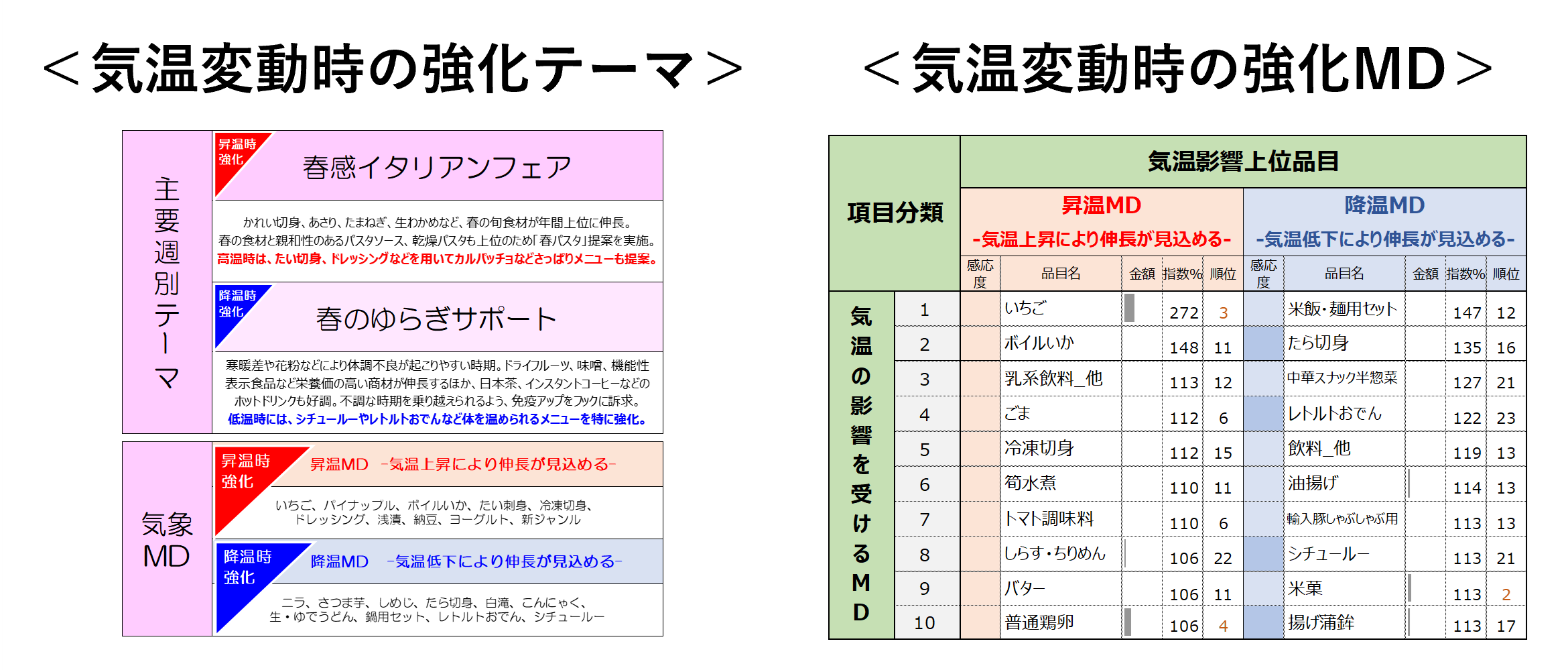 さらに、売上・年間指数・順位を踏まえて分析を行い、気温変動に応じて強化すべきMDの優先順位を整理。その結果、週別販促テーマの中で、昇温時・降温時に重点的に強化すべきテーマおよびMDを可視化できました。