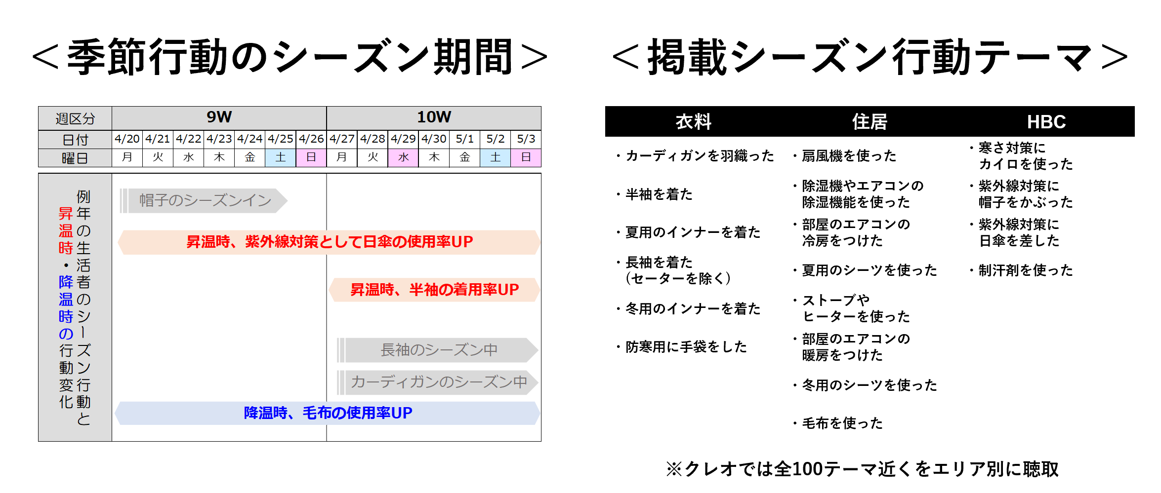 冷暖房や衣類、紫外線対策といった季節ごとの生活行動について”例年の行動開始・終了時期”に加え、気温変動による“行動タイミングのズレ”、シーズンイン/アウトの前倒し・後ろ倒しも明確化し、異常気象・気温急変時の生活者の行動シフトを可視化しました。POS実績だけでは読み取れない生活者の暮らし方を捉えることで、より生活者実態に沿った販促企画の検討を実現いたします。