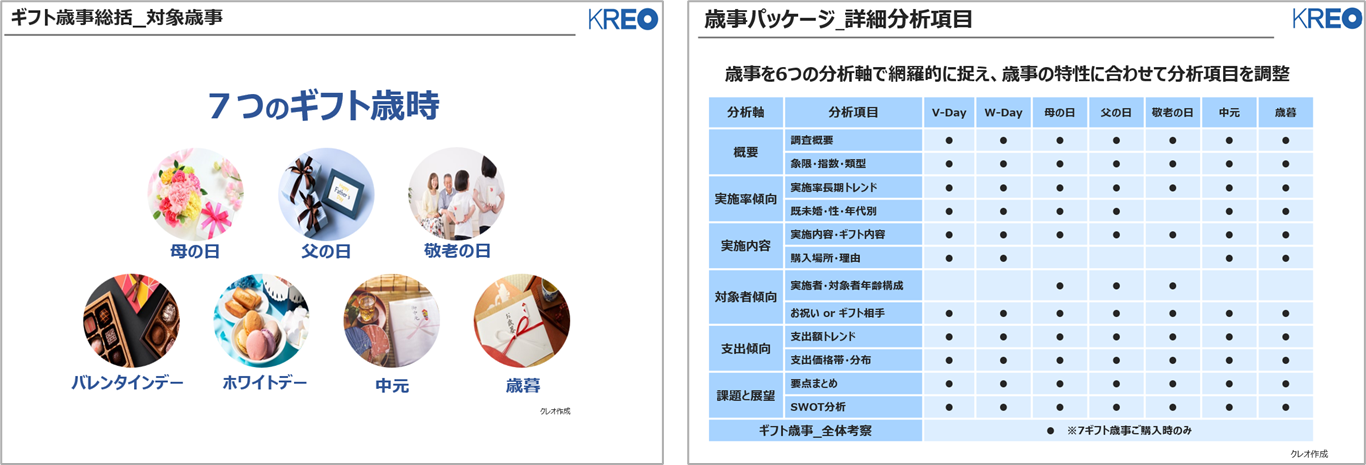 本レポートパッケージは、母の日/父の日/敬老の日/バレンタインデー/ホワイトデー/中元/歳暮という主要ギフト7歳事を網羅。十数年分の調査データを時系列で分析することで、これまで見えてこなかった「ファクト(事実)」を可視化しました。