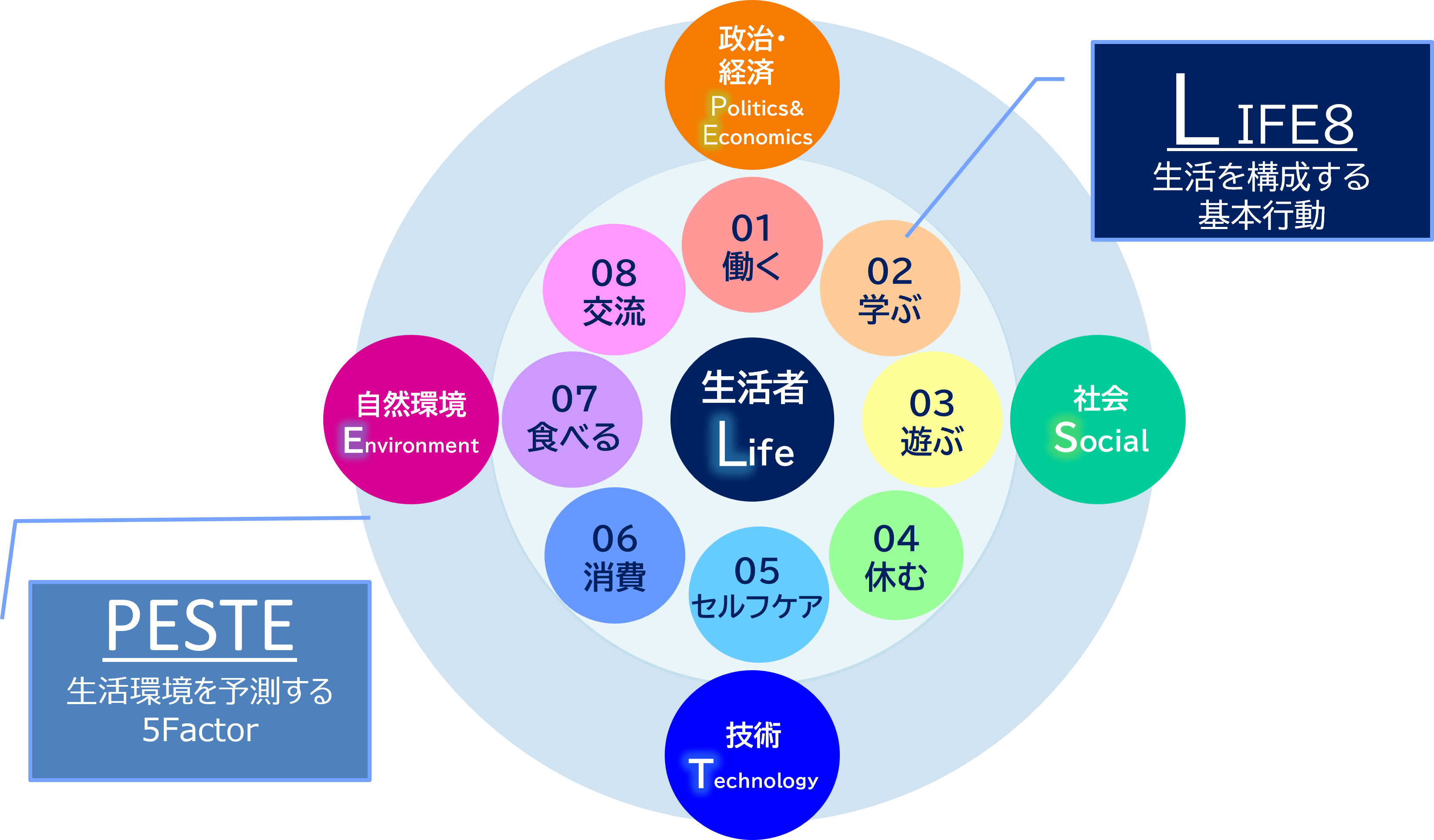PESTEL×8(ペステルエイト)とは、「働く・学ぶ・遊ぶ・休む・セルフケア・消費・食べる・交流」の8つの基本行動が、PESTEの影響でどう変化するかを多面的に捉える未来予測フレーム。