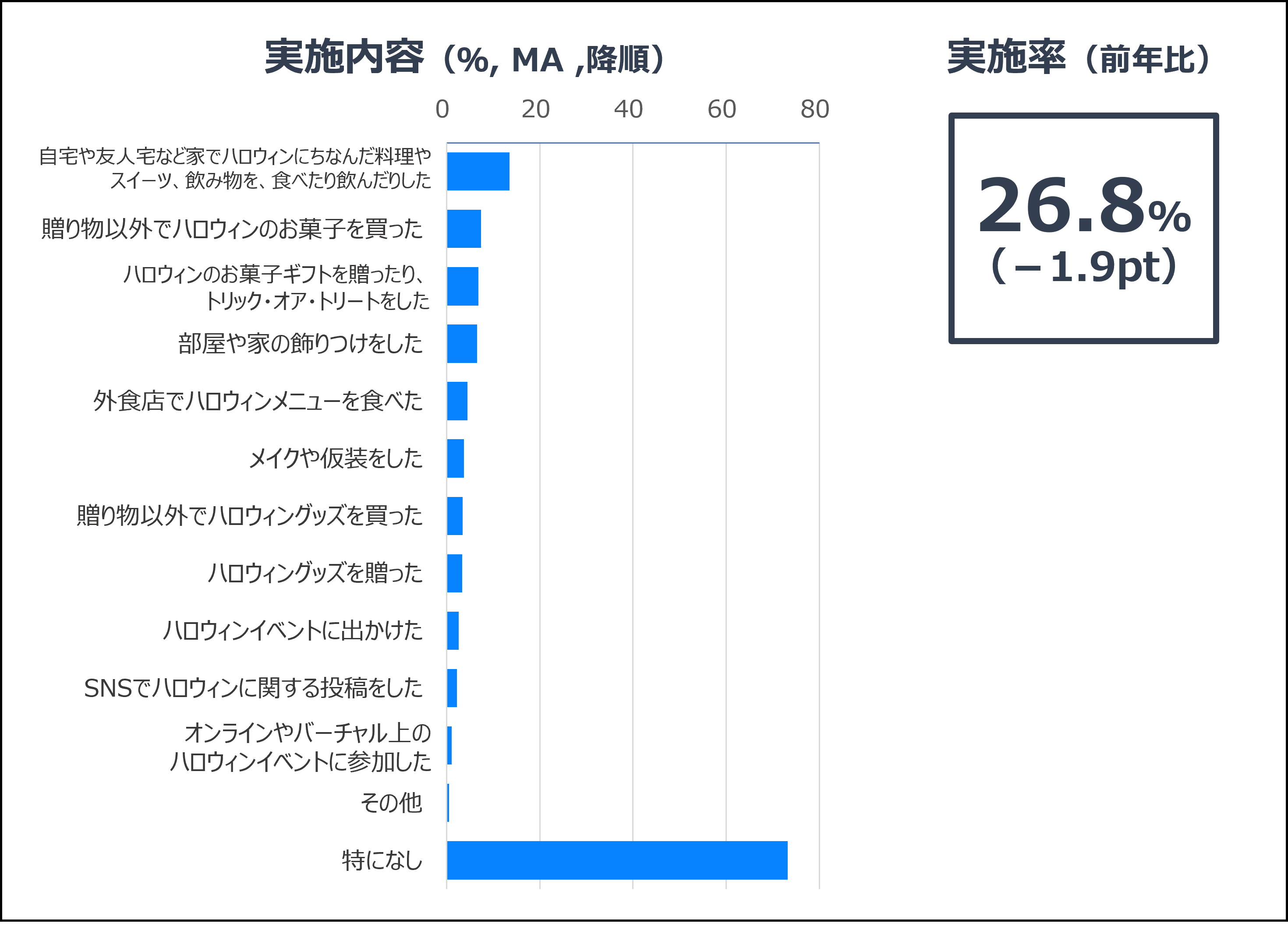 ハロウィンの実施内容は、「自宅や友人宅など家でハロウィンにちなんだ料理やスイーツ、飲み物を、食べたり飲んだりした」(13.5%)が最も多く、次いで「贈り物以外でハロウィンのお菓子を買った」(7.4%)、「ハロウィンのお菓子ギフトを贈ったり、トリック・オア・トリートをした」(6.8%)が続きました。
