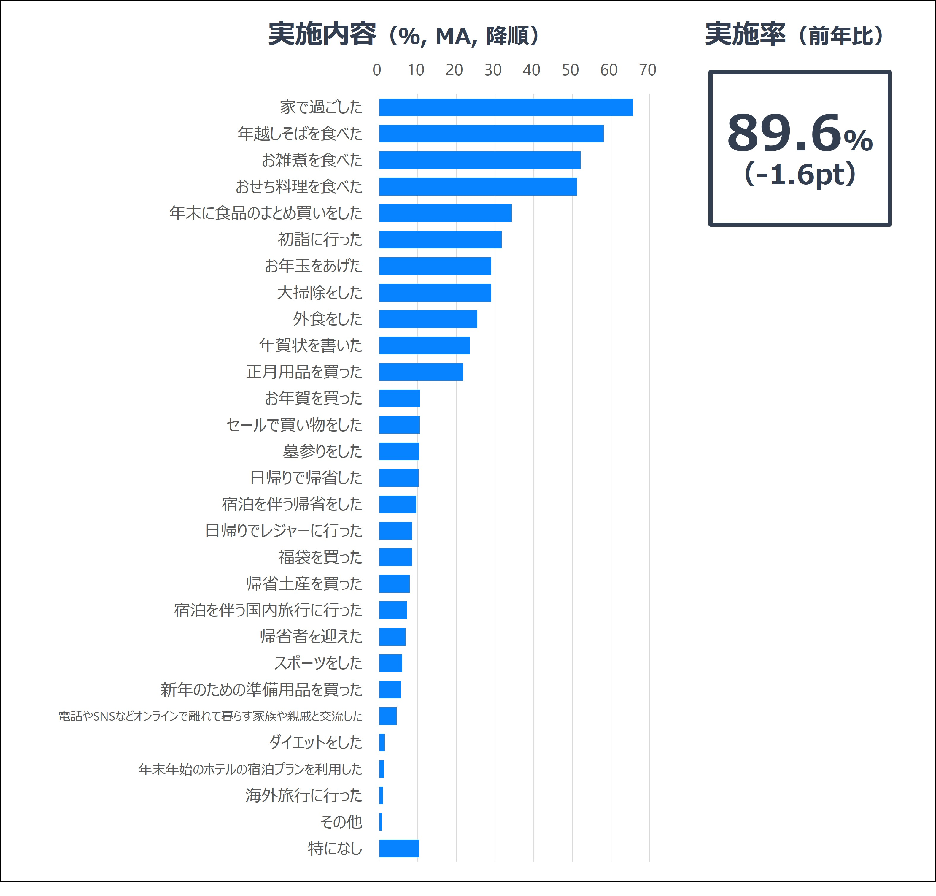 実施内容をみると「家で過ごした」「年越しそばを食べた」「お雑煮を食べた」「おせち料理を食べた」の4項目の実施率は5割を超えており、長期連休になる曜日まわりであっても、正月の行事食を味わい家でのんびり過ごすことを志向する人が多いことがうかがえた。
